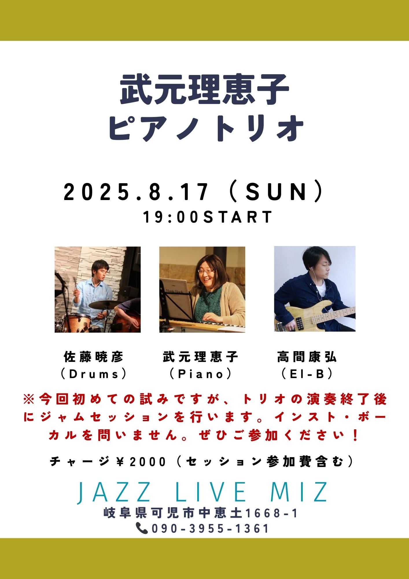 武元理恵子トリオLive&Session 武元理恵子(pf)・高間康弘(b)・佐藤暁彦(ds)